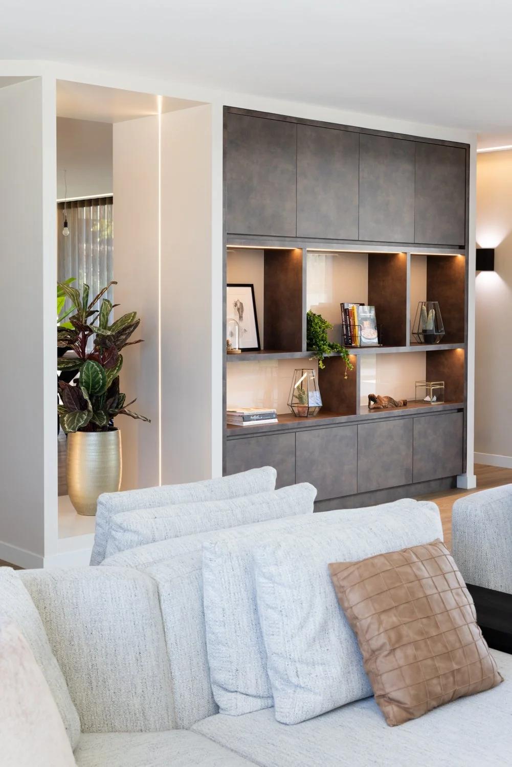 Tijdens de shoot stond het vastleggen van materiaalgebruik, detaillering en de ruimtelijke werking van het interieur centraal. De roomdivider is een echte eyecatcher: functioneel, doordacht en perfect geïntegreerd in de woonruimte. De keuken sluit qua stijl en afwerking naadloos aan, net als het maatwerk tv-meubel.
